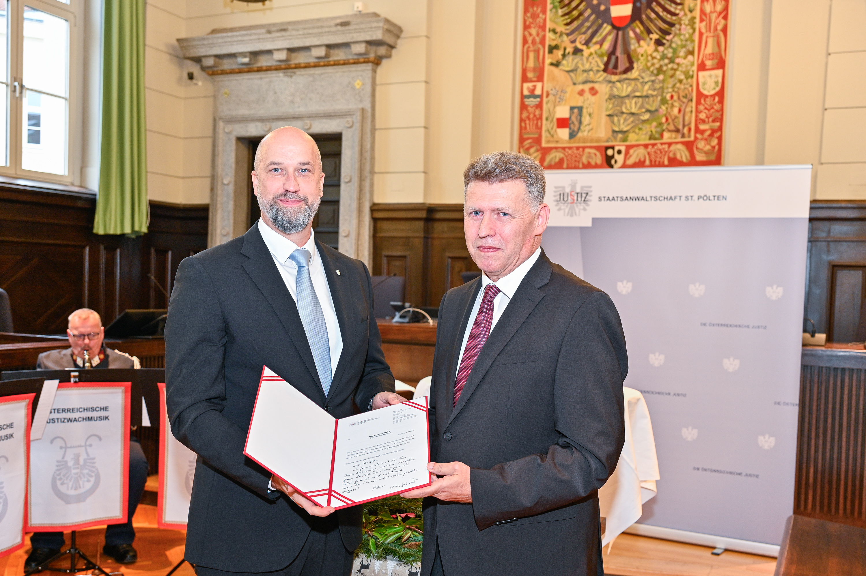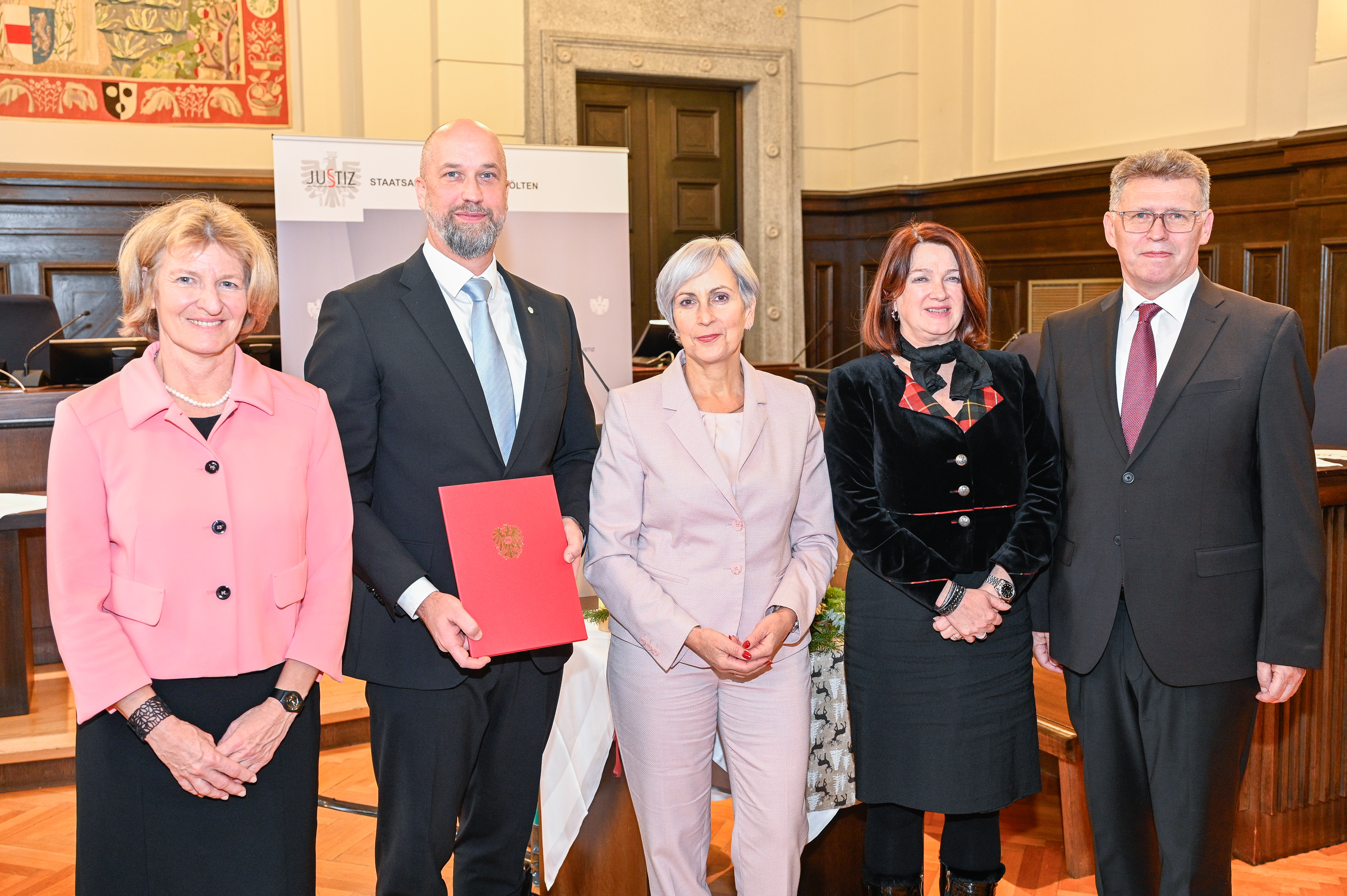 Am Donnerstag, den 27. November 2025, fand die offizielle Amtseinführung des neuen Leiters der Staatsanwaltschaft St. Pölten, Mag. Christian Pawle, statt. Dieser folgt damit Mag.a Michaela Schnell nach und wurde im Beisein von Bundesministerin Dr.in Anna Sporrer vom Leiter der Oberstaatsanwaltschaft Wien, Mag. Johann Fuchs, LL.M., feierlich in sein Amt eingeführt.